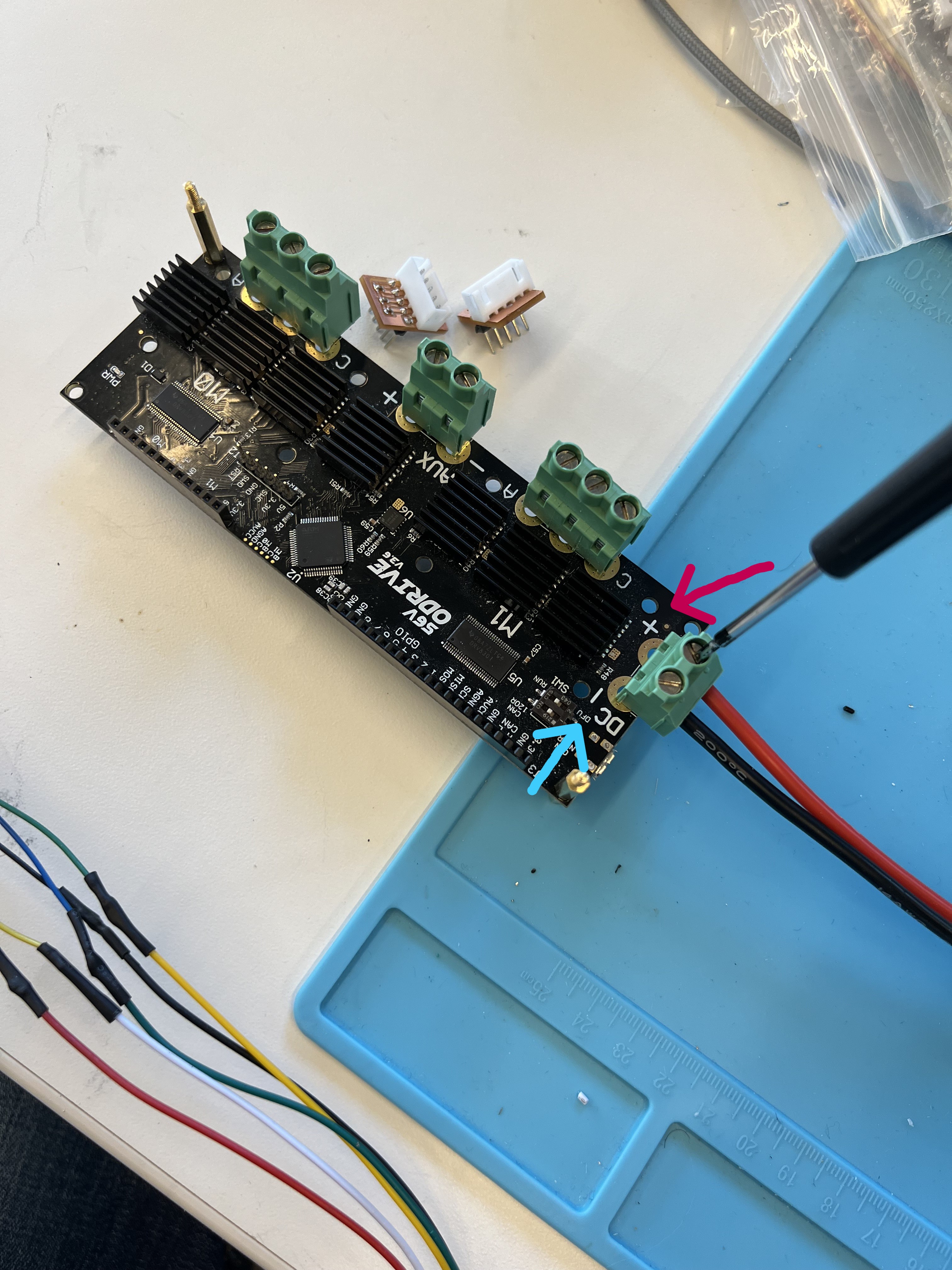 - Screw the phase wires (U, V, W) from each hub motor into the ODrive terminal blocks — M0 for the left wheel, M1 for the right wheel