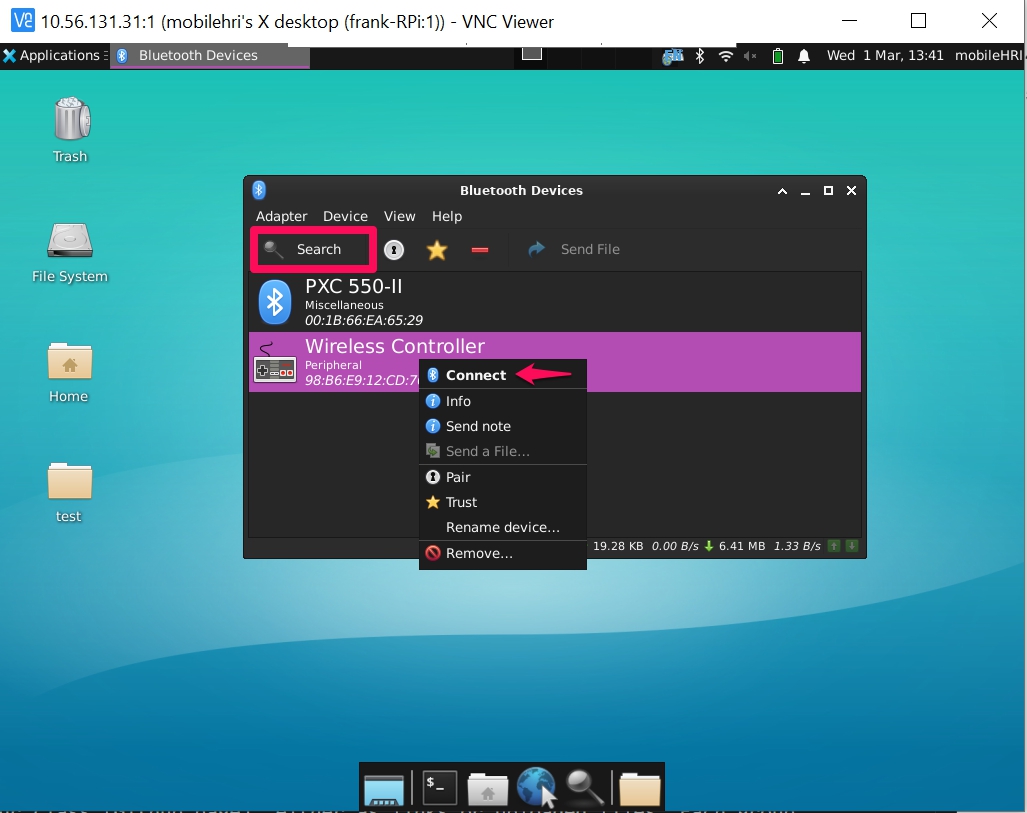 Open the Bluetooth manager (via VNC Viewer for GUI, or use